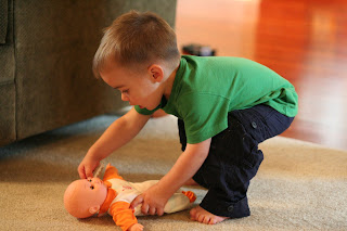 Cole is finally back to healthy after a week of being sick with a whole bunch of stuff including pink eye, an ear infection, and a 103 degree temperature. For a couple of days he pretty much just slept all day, had no appetite and was understandably quite whiny. No fun for any of us! After we got some antibiotics in him (which was NOT an easy job -- he fought the medicine like crazy), it wasn't long before he was back to his energetic self. My mom brought him this baby doll as a get-well present, which Cole likes to give medicine. We made up a medicine song to make taking medicine seem like fun (it didn't really work) so he sings it when he wants to give the baby medicine. Just like Cole, the baby gets medicine in her ears, eyes, nose and mouth. Good job, Dr. Badger.